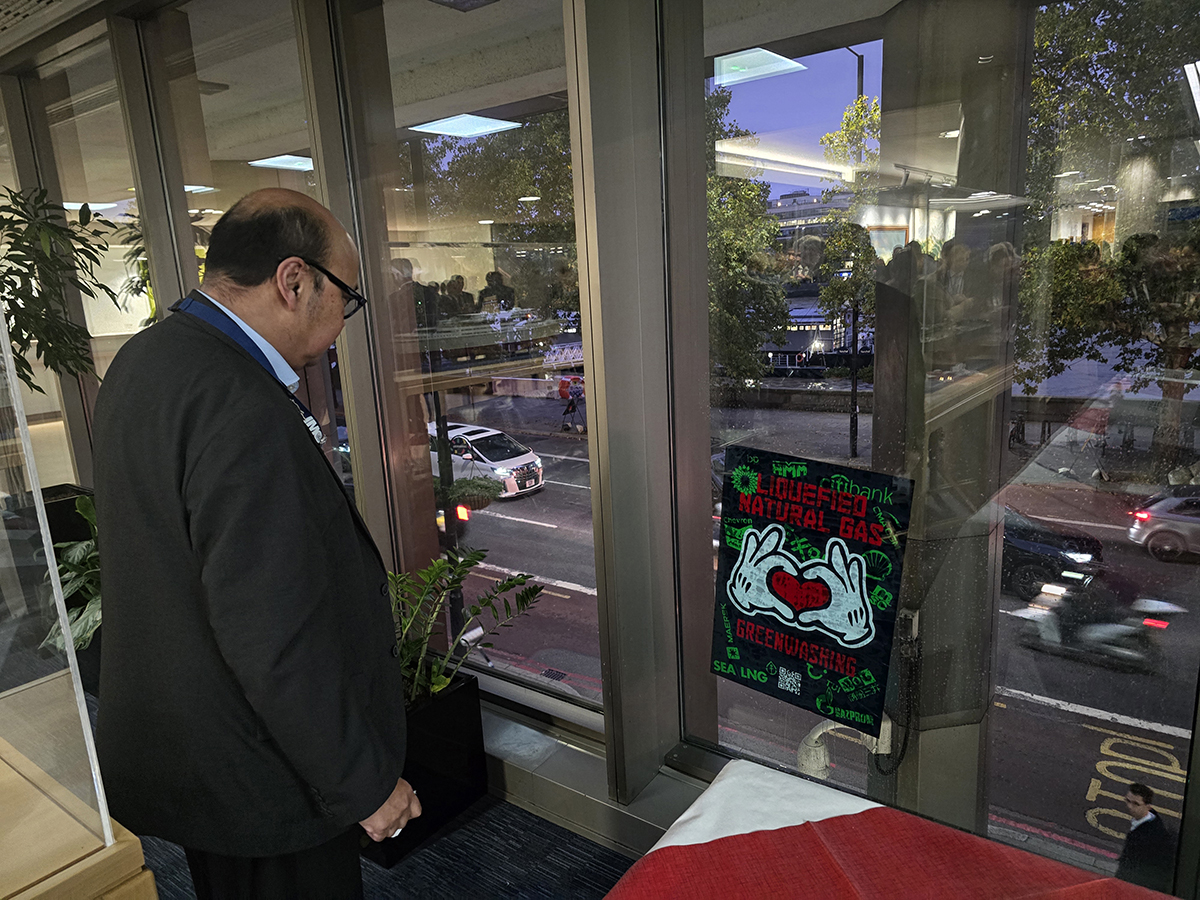⬆️ Why are there posters on the window? It’s to remind UN IMO Member States and delegates that all fossil fuels should be treated equally. After all ‘Liquefied Natural Gas ❤️ Greenwashing’ only when LNG escapes planned shipping pollution regulations.