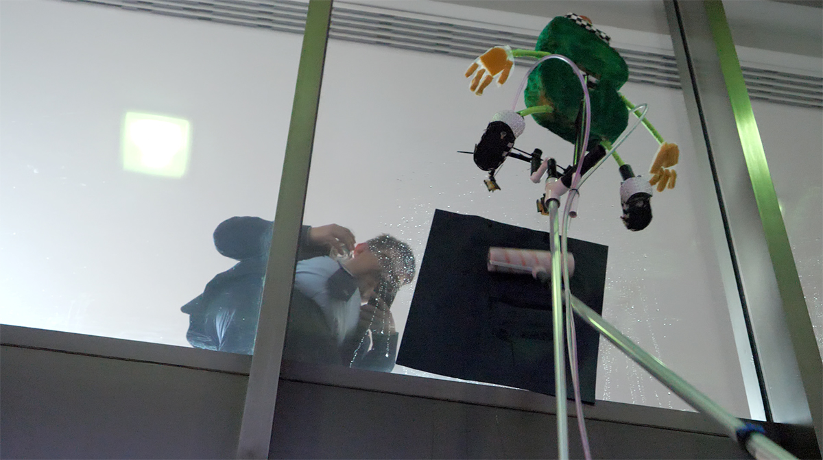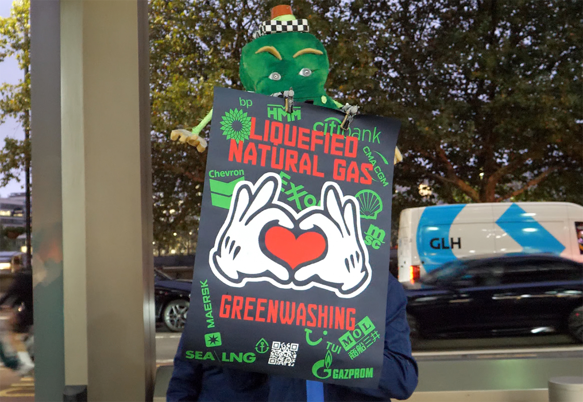 At 18:00hrs, while delegates were enjoying canapés and sipping wine, a ‘Scrubby the greenwashing Sponge’ appeared at the window of their reception holding a poster. A poster containing the graphic message ‘LIQUEFIED NATURAL GAS LOVES GREENWASHING’. The precarious Scrubby, operating on a long 4 metre pole, pasted the poster onto the window, giving everyone inside the opportunity to applaud its wonderful skills. It then bobbed down to the ground to pick up another poster to repeat the process until the IMO windows were obscured.